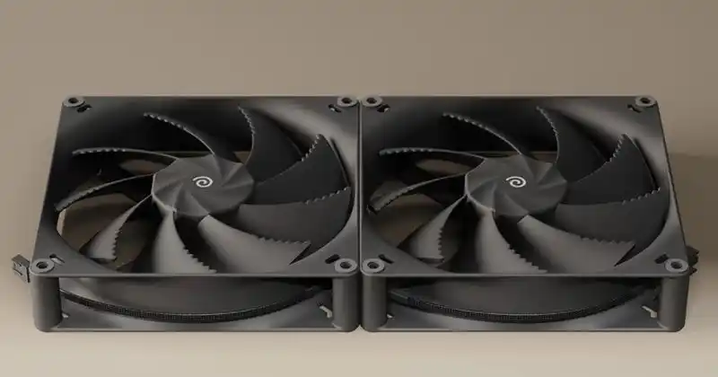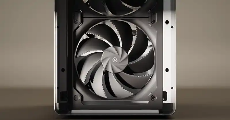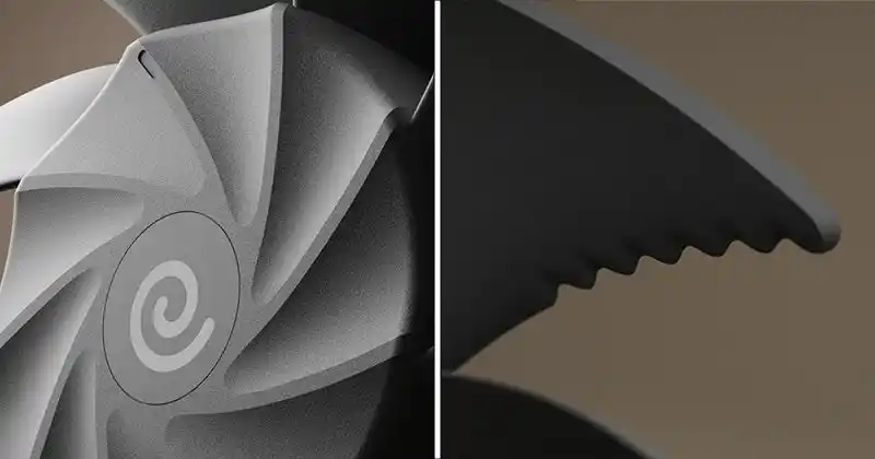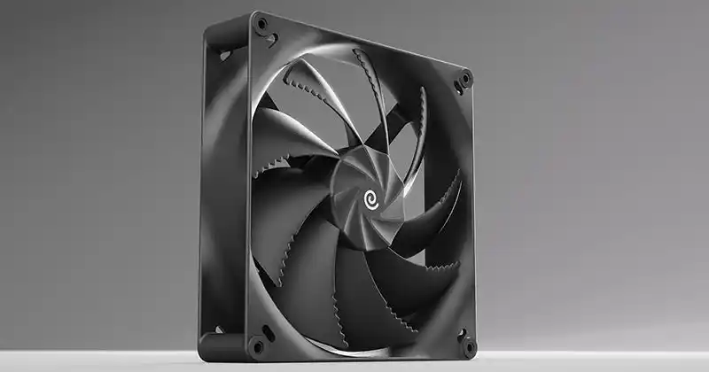 厚さを40mmにしたことで採用できた、長いFDBのベアリングが高い安定性と長寿命を実現しています。また、ファンの軸に傾斜を設けることで空気を効率よくブレードに送れ、ギザギザのブレード形状と共に静圧を向上させ、ノイズも低減しています。 |