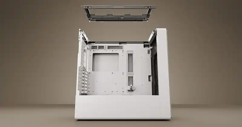 トップのファンブラケットはフレームと一体になっており、外すと広いスペースが生まれます。内部へ手を入れやすく、組み立て作業をしやすいデザインです。 |