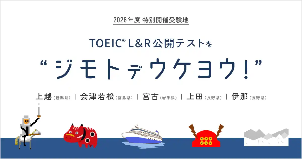 日本でTOEIC Programを実施・運営する国際ビジネスコミュニケーション協会(IIBC)(所在地:東京都中野区中野、理事長:藤沢 裕厚)は、2026年度TOEIC L&R公開テストを昨年に続き、「会津若松(福島県)」「宮古(岩手県)」「上越(新潟県)」「上田(長野県)」「伊那(長野県)」の5受験地で特別開催します。 |