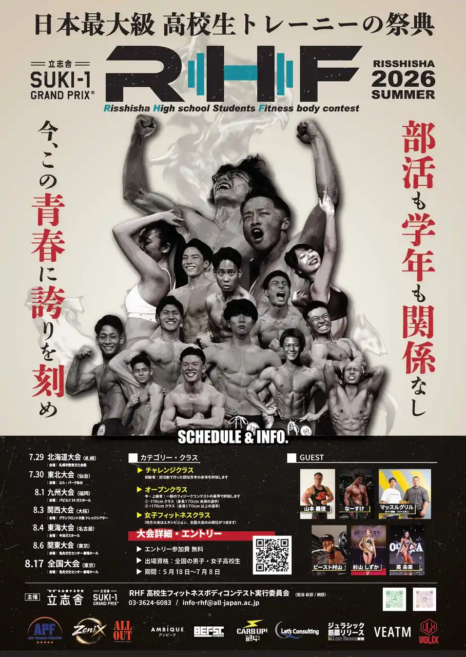 学校法人立志舎(所在地:東京都墨田区)が主催する「SUKI-1 GRAND PRIX」による【RHF(立志舎 高校生 フィットネスボディコンテスト)】の2026年夏大会の開催が決定いたしました。 |