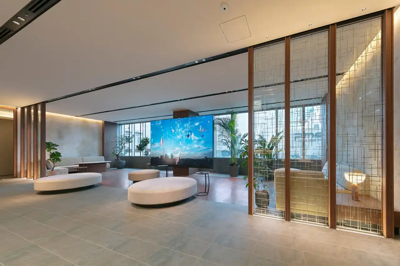 エレベーターホール正面にある重厚なエントランスホールの先には、180インチの大型LEDビジョンを設置した開放的なロビーがお客様をお迎えします。 |