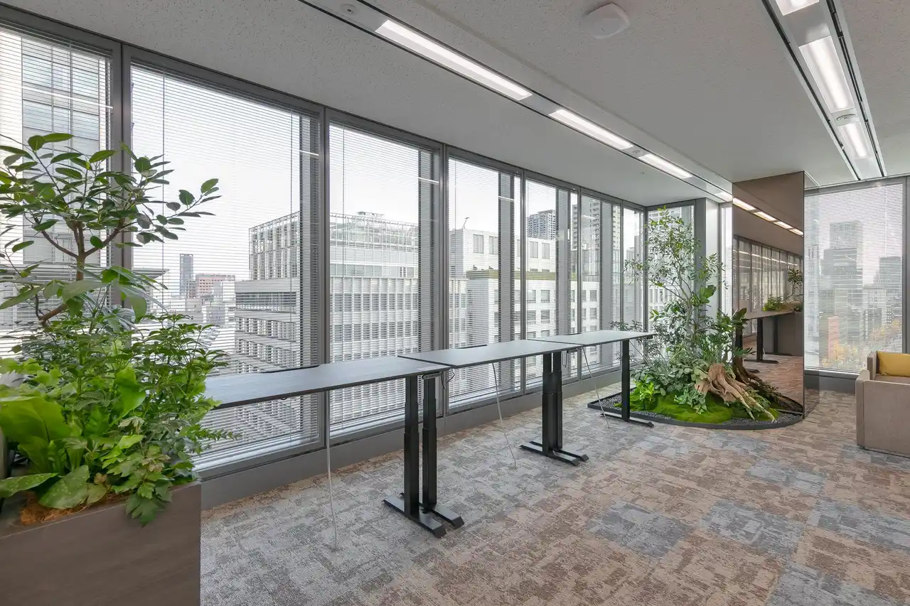 また、社員の健康に配慮した昇降デスクの導入やプライバシーを確保したWEB会議ブースや個人作業のための集中ブースの拡充により、生産性の最大化を図ります。 |
