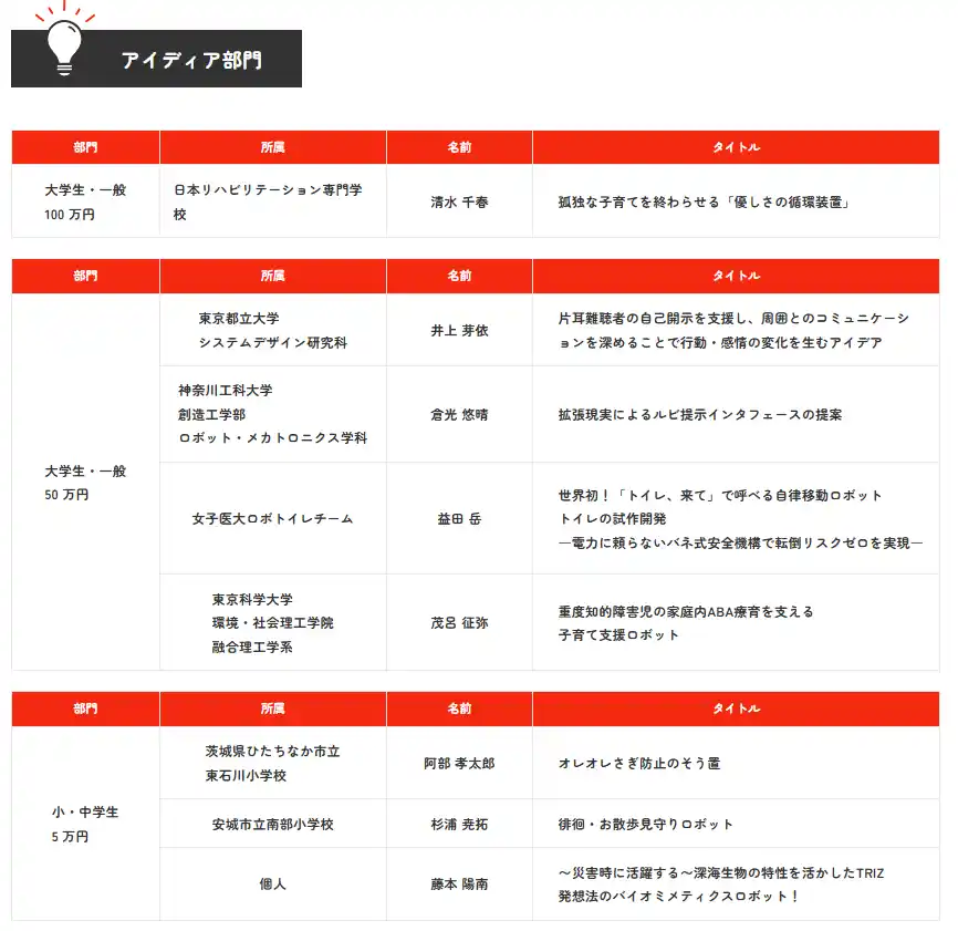 「ケアテック・イノベーション・コンテスト」は、介護だけでなく、障害者支援や学習支援、ヤングケアラーのサポートなども含めて“ケア”を広く捉え、社会のさまざまな課題に挑む場として設計されています。小学生から研究者まで、誰もが応募でき、アイディアでもプロトタイプでも参加できることが特徴です。外部メディアでも、小・中学生受賞者の挑戦が大きく取り上げられており、世代を超えて社会課題に向き合う場として注目を集めています。 |