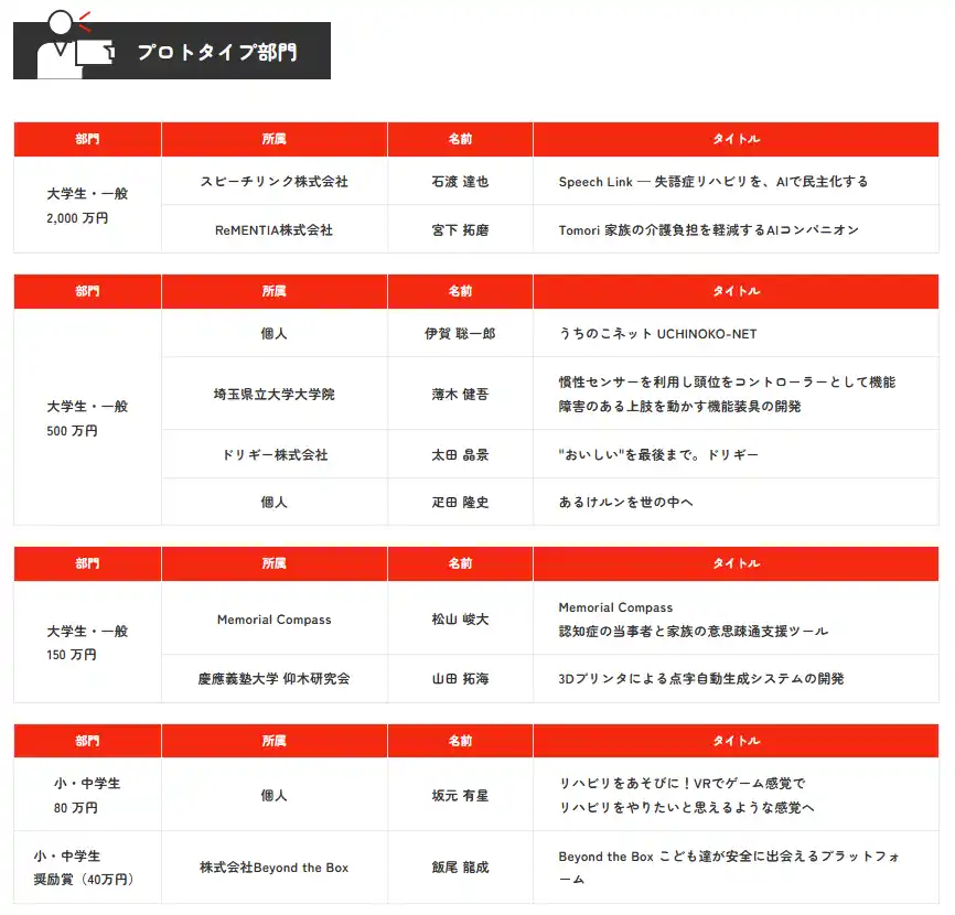 プロトイプ部門2,000万円枠の受賞者 |