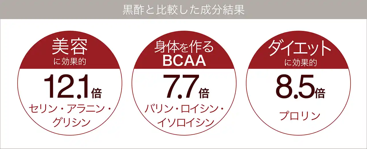 赤酢は、一般的なお酢に比べてアミノ酸が豊富に含まれており、まろやかな酸味と旨み、コク、香り高いのが特徴。ツンとした刺激が少なく飲みやすいことから、日々の食生活に取り入れやすい調味料です。 |