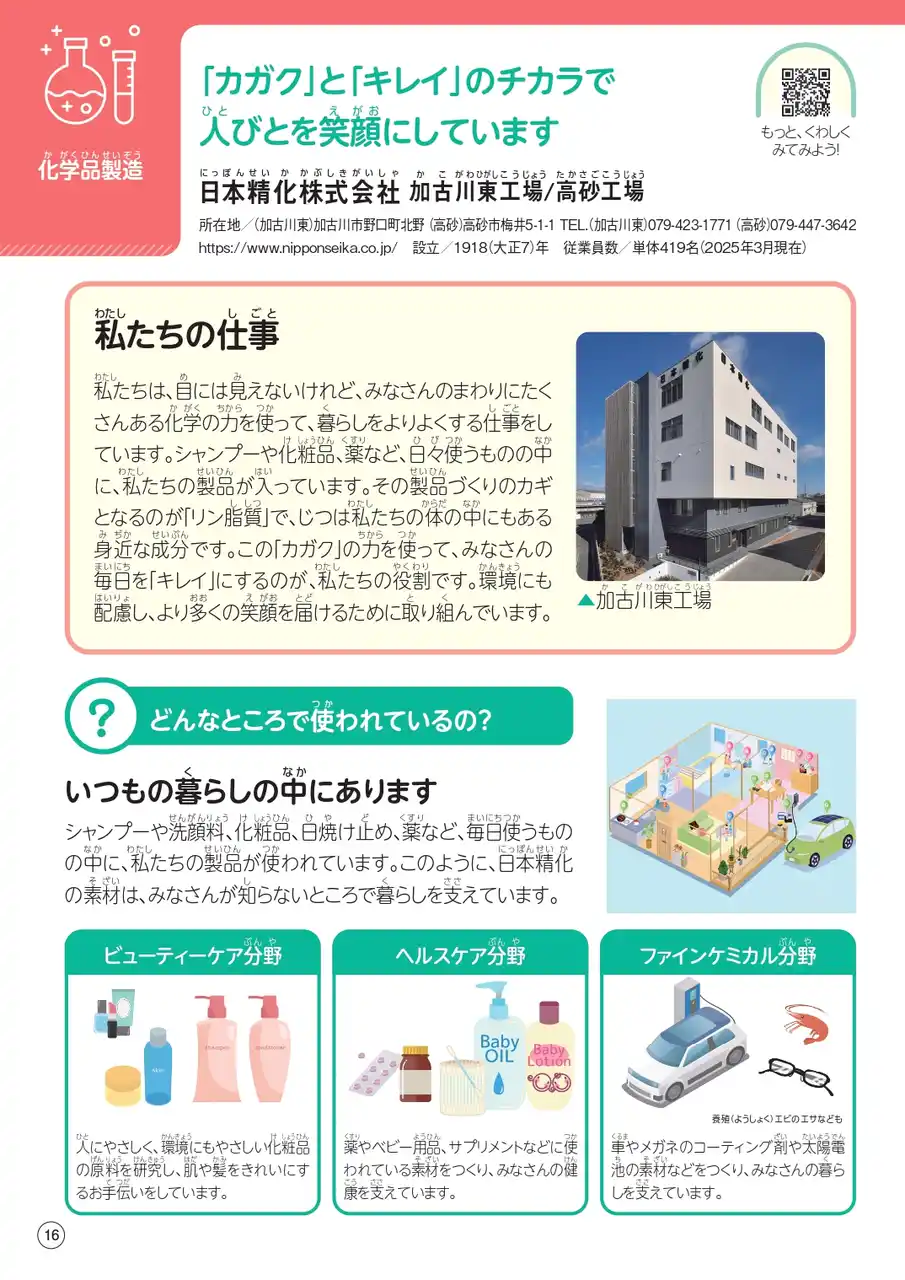 日本精化株式会社(本社:大阪市中央区、代表取締役執行役員社長:矢野 浩史)は、株式会社中広が発行する「小学生のためのお仕事ノート 2026年度加古川市・高砂市版」に掲載されましたことをお知らせいたします。 |