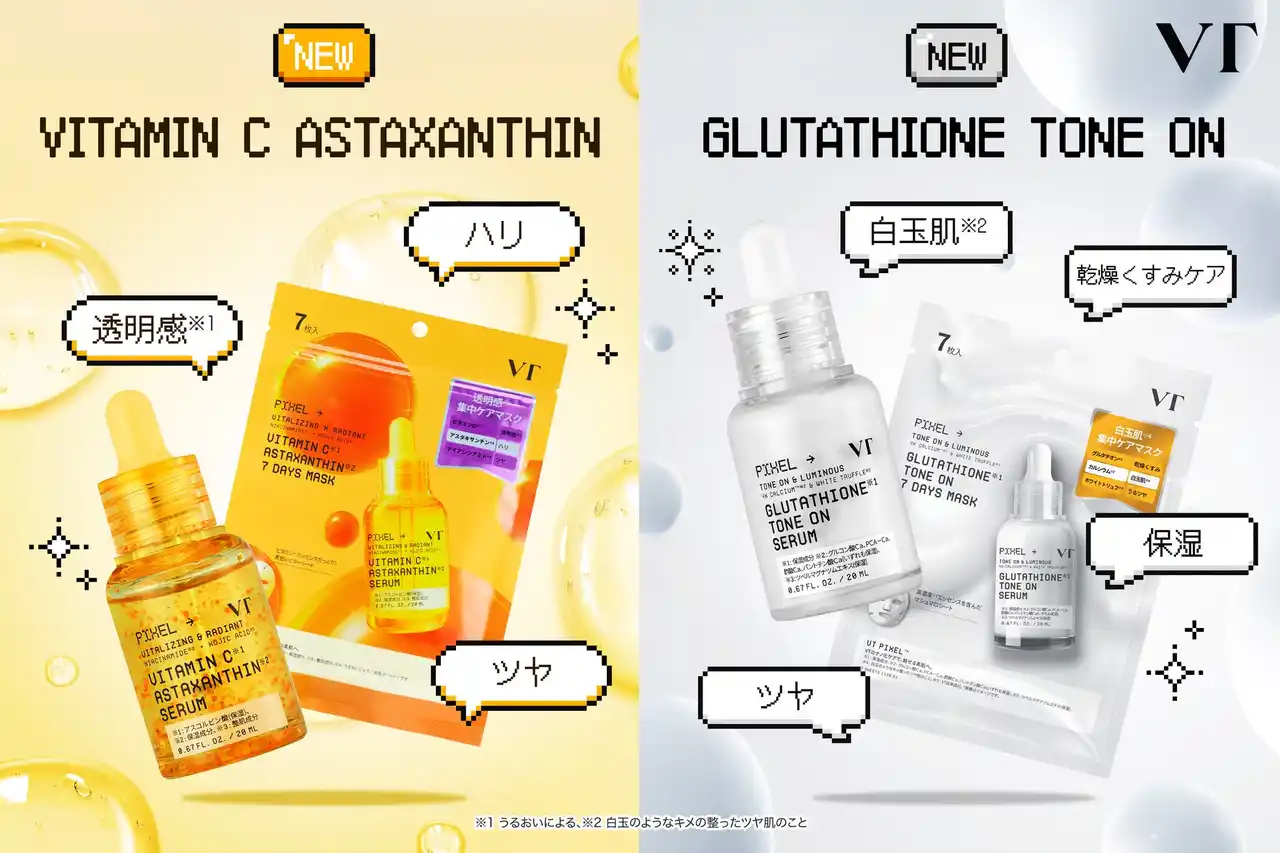 韓国発のスキンケアブランド「VT COSMETICS」は、2026年4月18日(土)より、VT独自のPIXEL工法を新たに採用した「ビタミンC アスタキサンチン」ラインと「グルタチオン トーンオン」ラインを順次発売開始いたします。 |