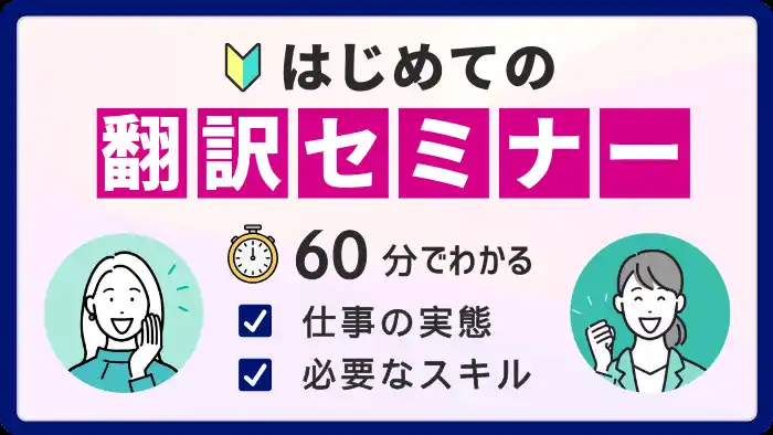 | 本セミナーでは、翻訳の全体像がわずか60分で整理できるとともに、AI時代に求められるスキルや、学んだ内容をどのように仕事へとつなげていくのかといった、具体的なステップについて理解が深まります。 | ||||||||||||