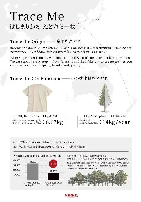 会場では、全ての工程履歴が追跡可能なTシャツを初公開します。牧場、原毛、糸、生地、染色整理、縫製から製品にいたるまでの履歴を追跡できるだけでなく、工程ごとのCO2排出量を把握することが可能なTシャツです。 |
