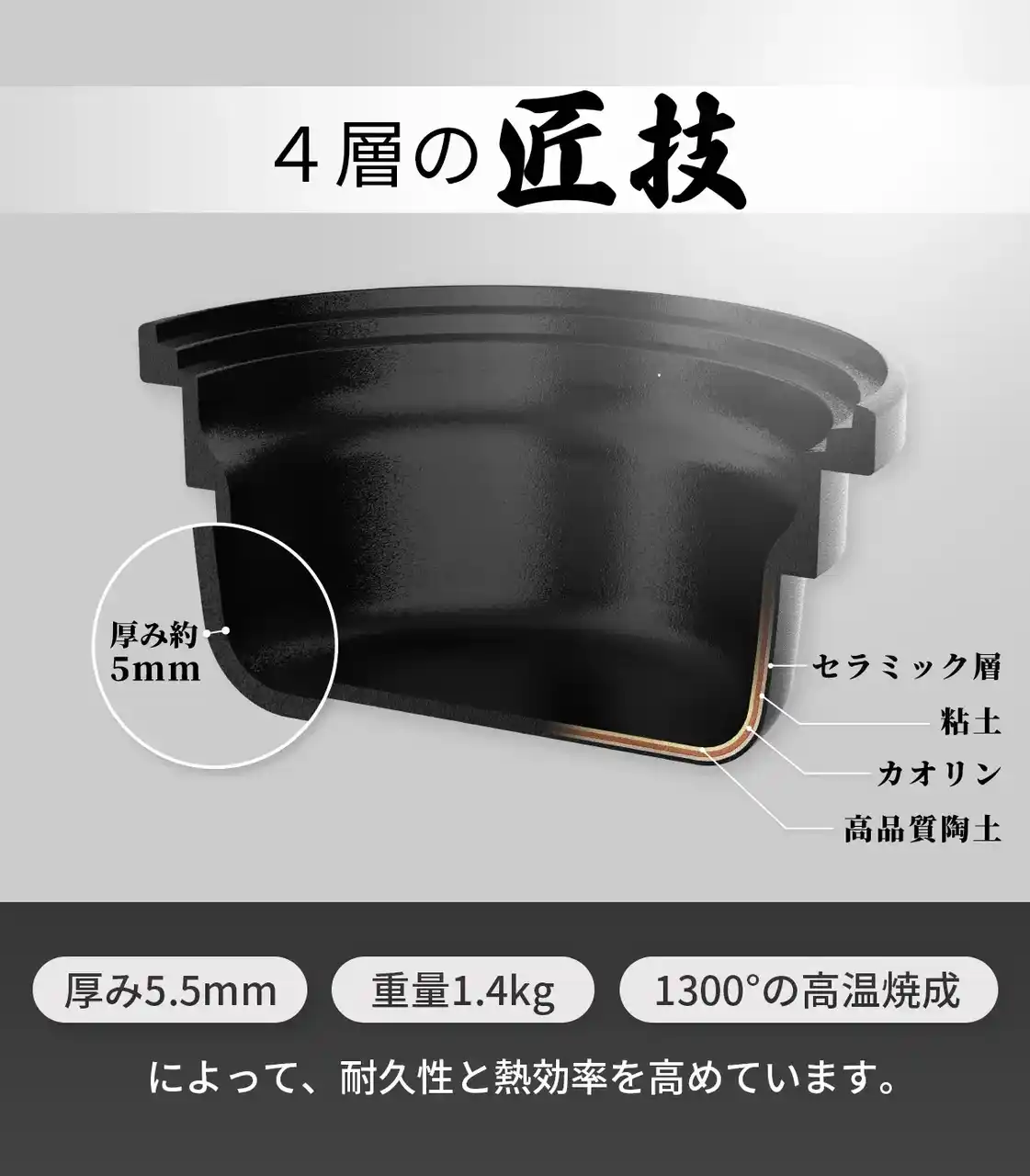 4層構造で仕上げた土鍋内釜が、熱をしっかり蓄えながら均一に伝え、米の旨みを最大限に引き出します。 |