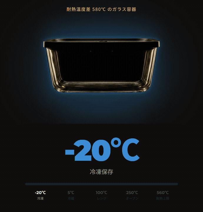 冷凍保存からオーブン調理まで、容器を移し替える必要がありません。採用している高ホウケイ酸ガラスは、耐冷-20℃・耐熱560℃と幅広い温度域に対応。急加熱・急冷却にも強いプロユース品質のガラス素材です。 |