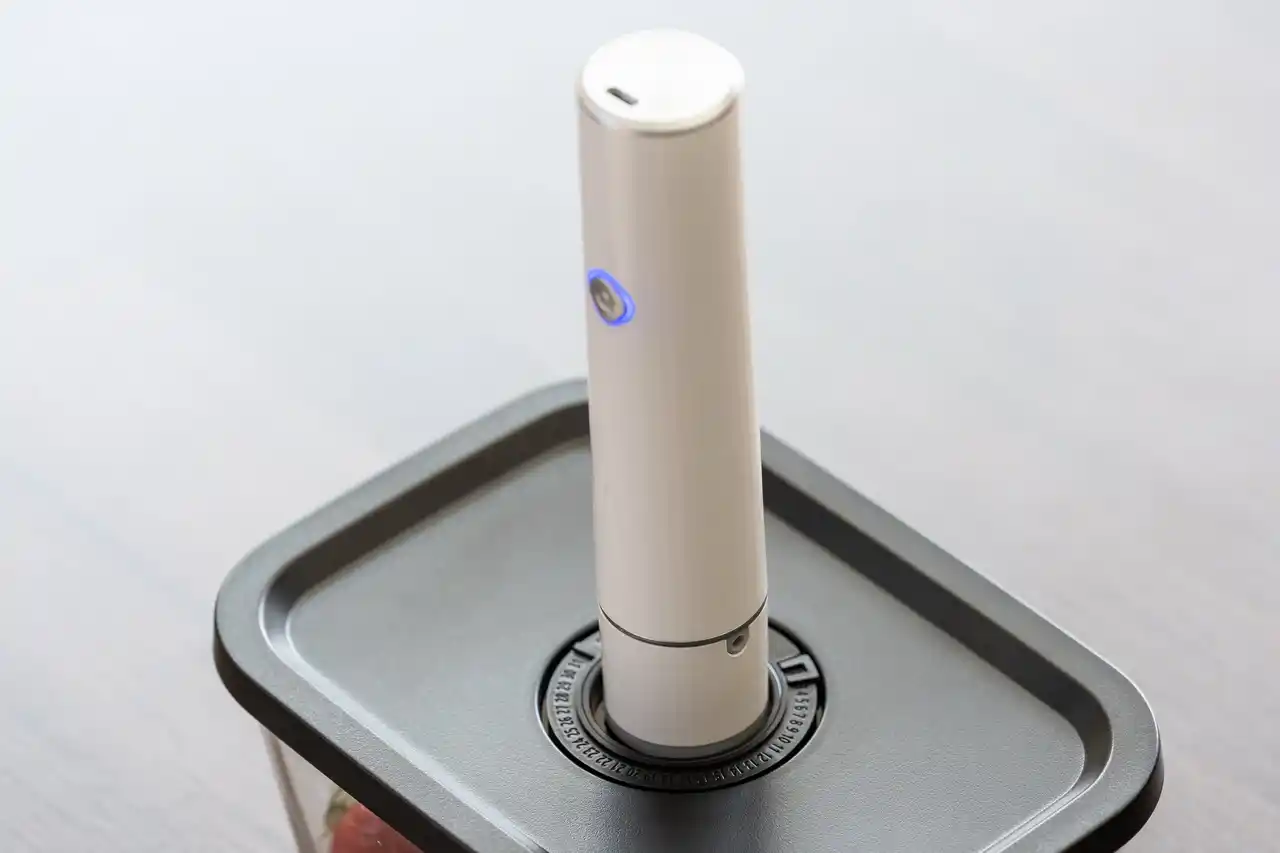 蓋の上から「STOQ Slim Pump」のボタンを押すだけ。約10秒で自動的に真空引きが完了し、真空検知機能により自動停止します。容器内の酸素を抜くことで酸化と菌の繁殖を抑え、食材の鮮度を長くキープします。 |