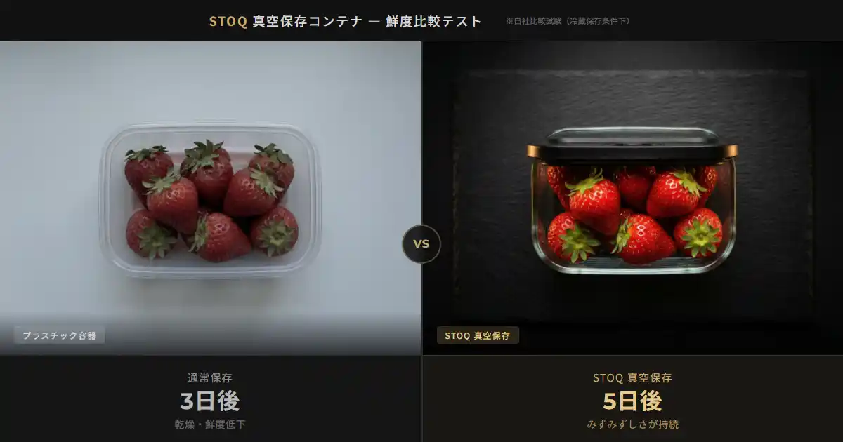 一般的なプラスチック容器で保存したいちごと、STOQ真空保存のいちごを同条件で比較実証。通常保存では3日後に変色・乾燥が進行する一方、STOQ真空保存では5日後もツヤと香りをキープしていました。 |