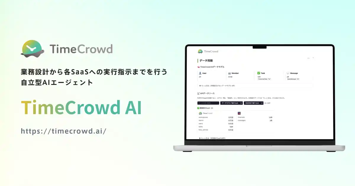 「生きた時間を増やす」をミッションに掲げ、タイムトラッキングSaaS「TimeCrowd」を提供。10年以上にわたり企業の業務時間データの可視化・分析を支援し、国内5,500社超・6万人以上の利用実績を持つ。TimeCrowd AIでは、この時間データ分析ノウハウを活かし、AIによる業務自動化の新領域に進出する。 |