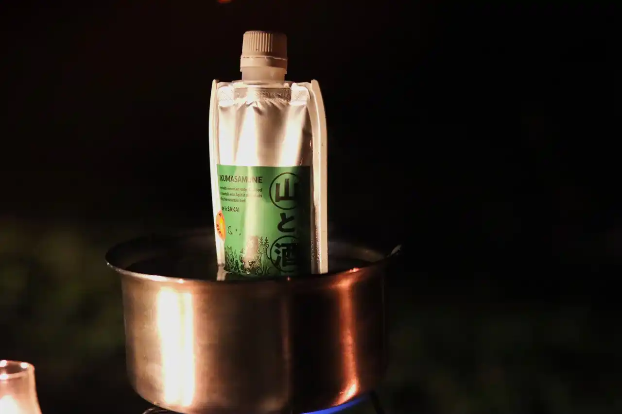 冬は焚き火やバーナーで温めて熱燗に。 夏はクーラーボックスで冷やして、きりっと爽やかに。 |