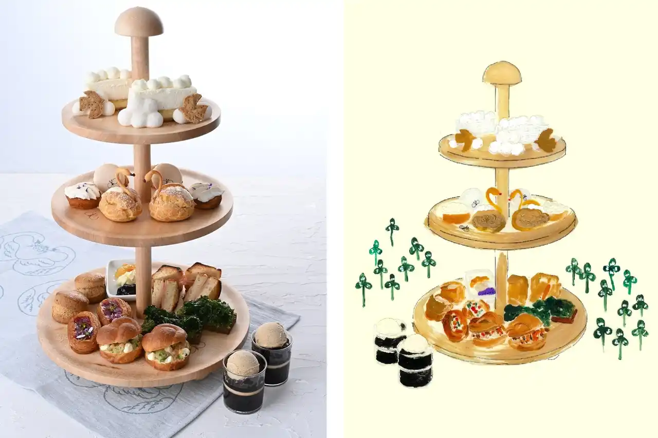会場に並ぶティースタンドは、mina perhonenとマルニ木工が“陽だまりの中で過ごすヒュッゲなひととき”を思い描いてデザイン・制作した特別なもの。そのティースタンドにおいしさと物語を添えるのは、今回のモチーフである二羽の白鳥“To svaner(トゥ スヴェーナー)”を主役に、空や湖の風景をイメージしながらmina perhonenが監修し、広島アンデルセンがつくったパンやスイーツが並びます。バスケットを広げたように彩られたティースタンドとともに、小さなピクニック気分をお楽しみください。 |