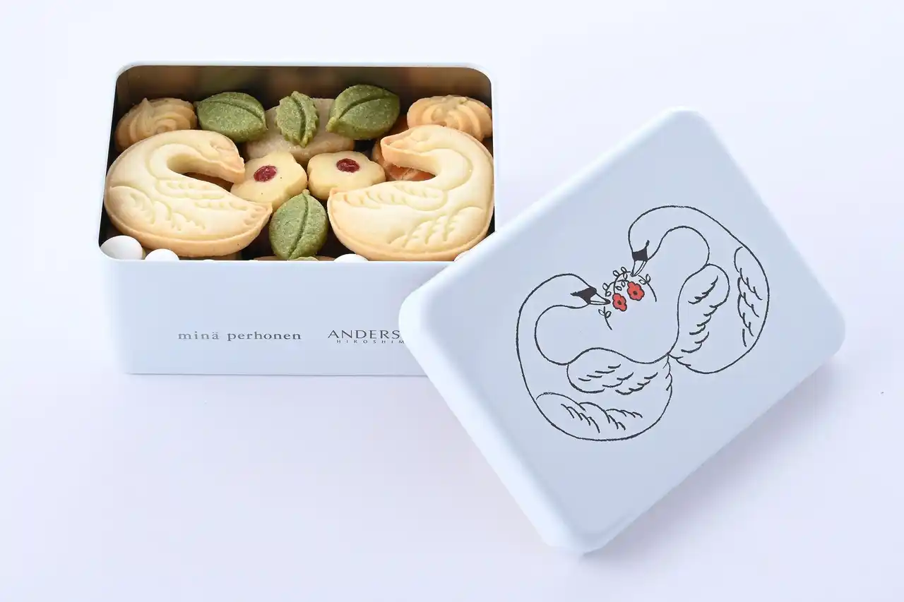 双子の白鳥が湖でゆっくりと佇んでいるひとときを表現しました。缶の中には、11種類のクッキーを詰め合わせ。 |