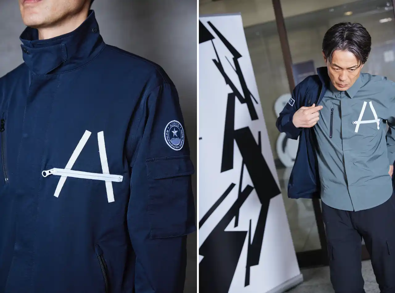 ブルゾンは、チンストラップの着脱によりスタンドカラーとしても使用できる仕様です。胸元には建設現場で使用する小型手帳「野帳」がぴったり収まるサイズのポケットを配置しました。背面・正面に配した大ぶりのロゴは、着用者自身が会社の「広告塔」となることを意識したデザインです。 |