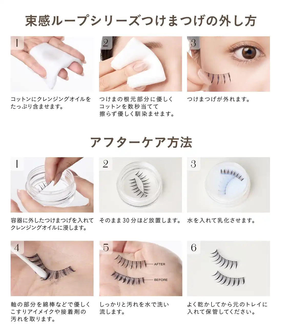 オイルクレンジングを使用すると、毛束が壊れてしまうくらいの繊細な製法で作られていたDintyの束感つけまつげですが、オイルクレンジングでオフしても、毛束が壊れにくく、くり返し使える製法になった新しいシリーズが「束感ループシリーズ」です。 |