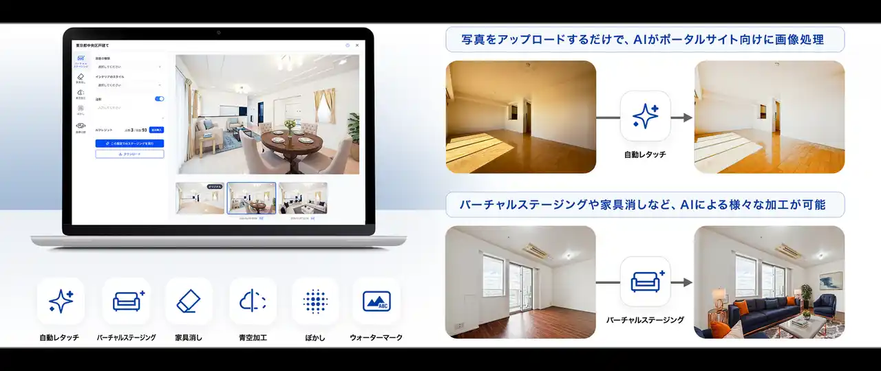 AIバーチャルステージング(家具置き):空室の物件写真にAIが家具を配置し、入居後の生活をイメージしやすいバーチャルステージング画像を生成します。 |