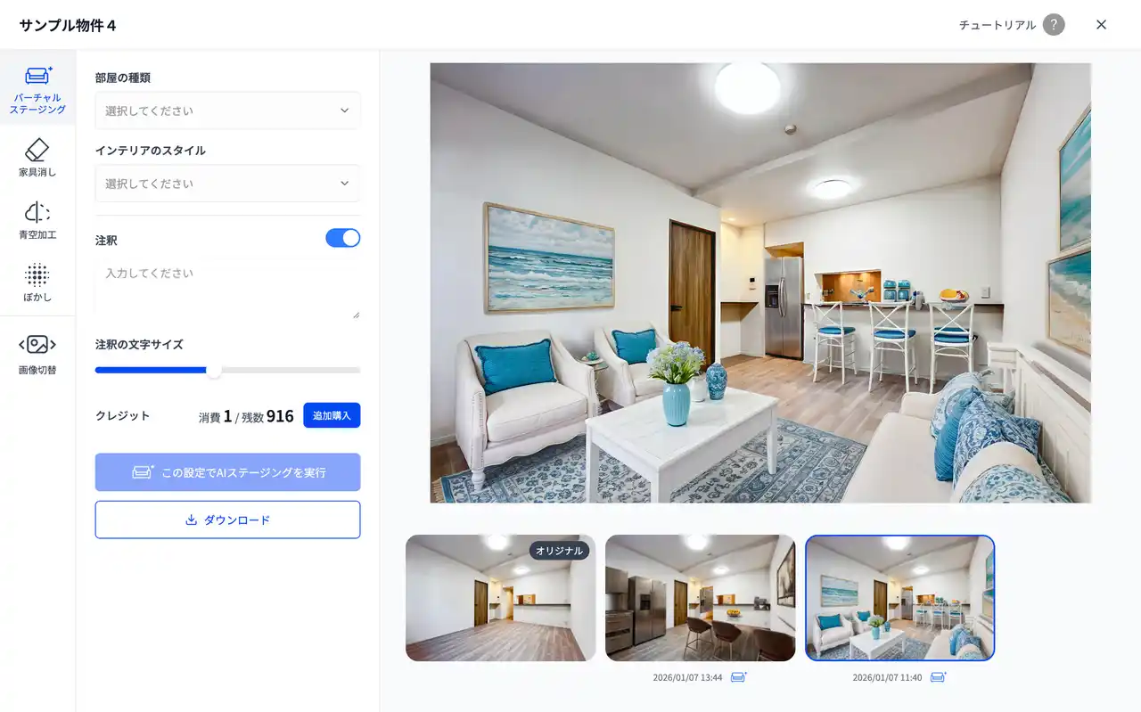 AIバーチャルステージング再生成機能:1クレジットで、配置する家具の種類を変更して同部屋のバーチャルステージング画像を複数枚を再生成可能になります。 |