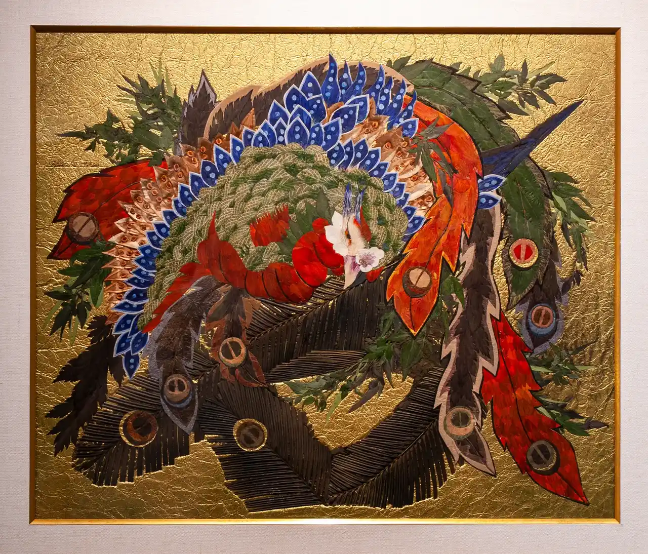 葛飾北斎が小布施岩松院に描いた「八方睨み鳳凰図」をモチーフに、すべてを植物で表現した「押し花鳳凰」では、普段は柔らかく優しい雰囲気の植物が力強い姿に変貌し、そのダイナミックな造形に衝撃を受けると同時に、押し花という表現の可能性に圧倒されます。 |