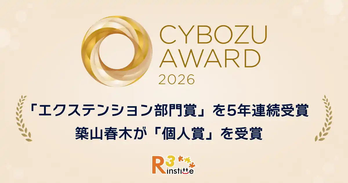 アールスリーインスティテュート(本社:大阪府大阪市、代表取締役:西松顯、以下「当社」)は、サイボウズ株式会社(本社:東京都中央区、代表取締役社長:青野 慶久、以下サイボウズ)のパートナー表彰制度である「CYBOZU AWARD 2026」において、エクステンション部門賞と、個人賞を受賞いたしましたのでお知らせいたします。 |