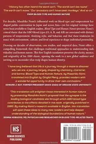 数十年の間、能見正比古による血液型と気質に関する影響力のある著作は、日本とアジア全域の人々との対話を行ってきましたが、彼のオリジナル版は英語圏の読者には利用できませんでした。『Blood Type and Human Nature』は、ABO血液型(O、A、B、AB)が気質、思考スタイル、行動の異なるパターンに関連しており、これらの傾向が環境、文化、生活体験と相互作用して個人の性格を形成するという能見の主要なテーマを提示しています。 |