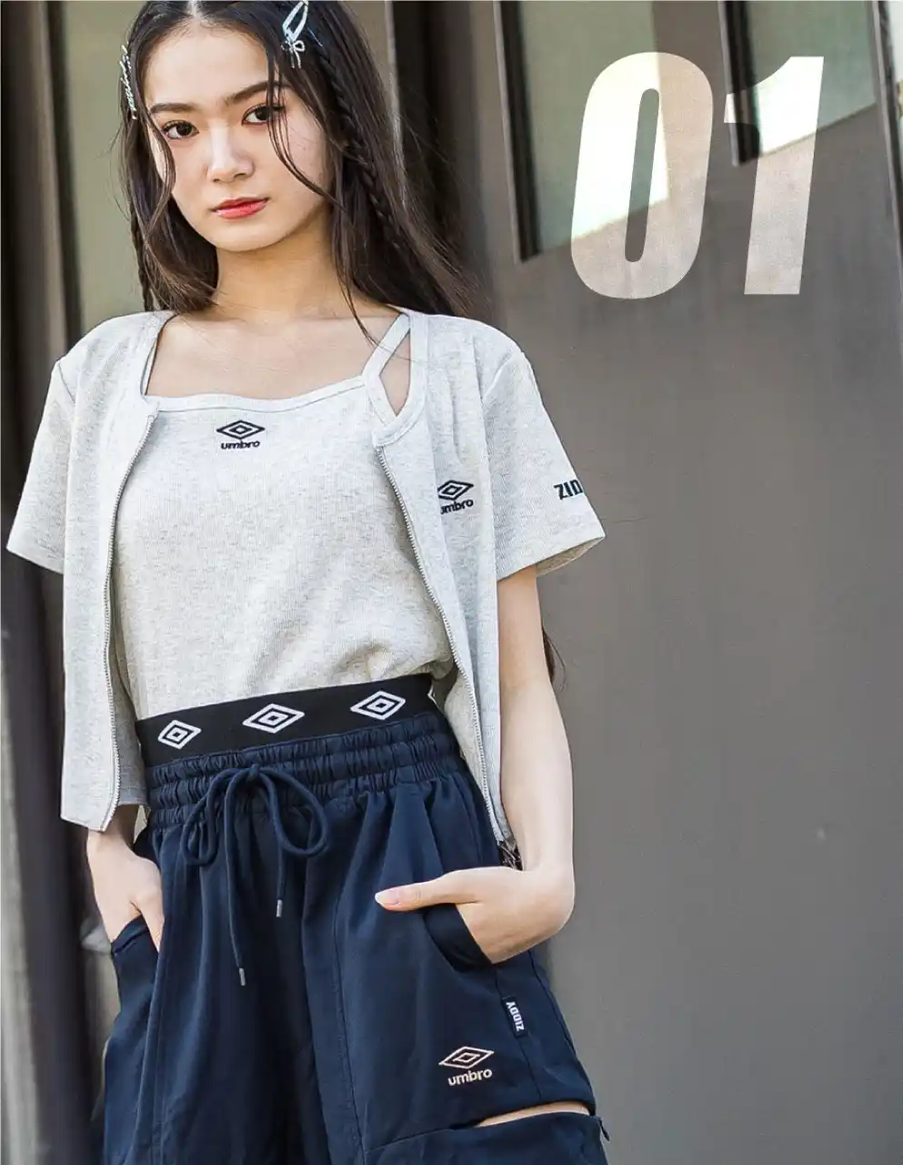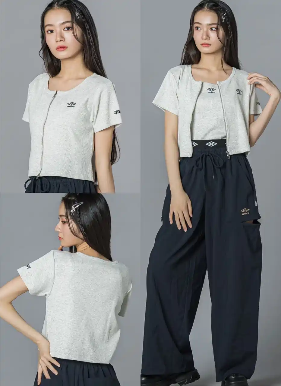 ジップを開けてヘルシーな肌見せを楽しめる、ZIDDY×「umbro」ならではのクールなスタイリング。ダンスシーンや日常のアクティブコーデにも最適です。 |