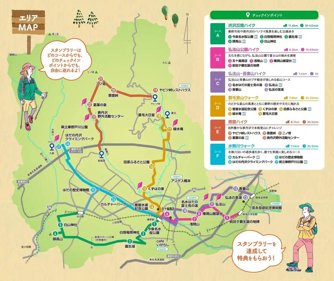 本イベントは、昨年約9,000人の方にご参加いただいた人気のスタンプラリーです。個性豊かな6つのコースを用意しており、秦野の自然を満喫できるハイキングや、雄大な表丹沢の景色を眺める登山、歴史ある街歩きなど、それぞれ異なる魅力を体験できます。 |