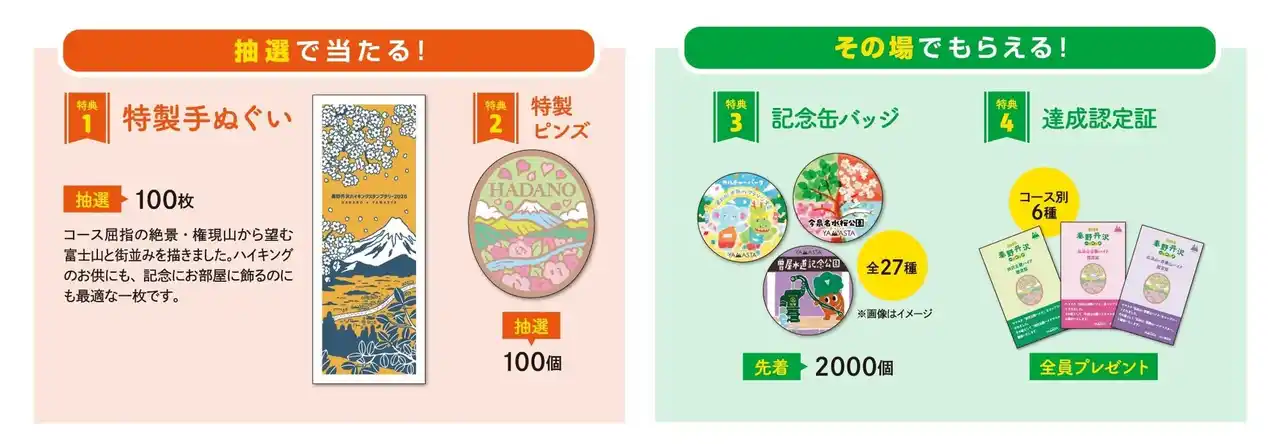 各コースを達成すると、記念缶バッジと達成認定証がもらえます。さらに、抽選で当たる特製手ぬぐいや、山のお土産ブランド「Yamasanka(ヤマサンカ)」とコラボした特製ピンズに応募できます。 |