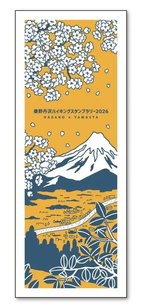 スタンプラリーを達成すると応募できる特典として、昨年好評を博した「特製手ぬぐい」が2026年度版の新デザインで今年も登場します。「関東の富士見百景」にも選ばれた権現山から望む富士山と秦野の街並みを描いた、飾って楽しめるタペストリー風のデザインです。スタンプを集めてぜひご応募ください。 |