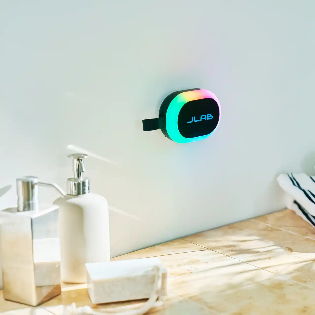 今回新発売する3つのポータブルスピーカーには、音楽に合わせて光るRGBライトを搭載。日常を「音と光」で盛り上げます。音質やライトの発光パターンは、JLabアプリから自由にカスタマイズ可能。その時の気分やシーンに合わせた空間を自在に演出します。防塵防滴仕様のため、浴室やアウトドアなど場所を選ばず大活躍。さらに、ポータブルスピーカーが2台あれば「LabSync(ラブシンク)モード」でパワフルな2チャンネルステレオシステムを構築可能に。より広く、没入感のある立体的なサウンドをお楽しみいただけます。 |