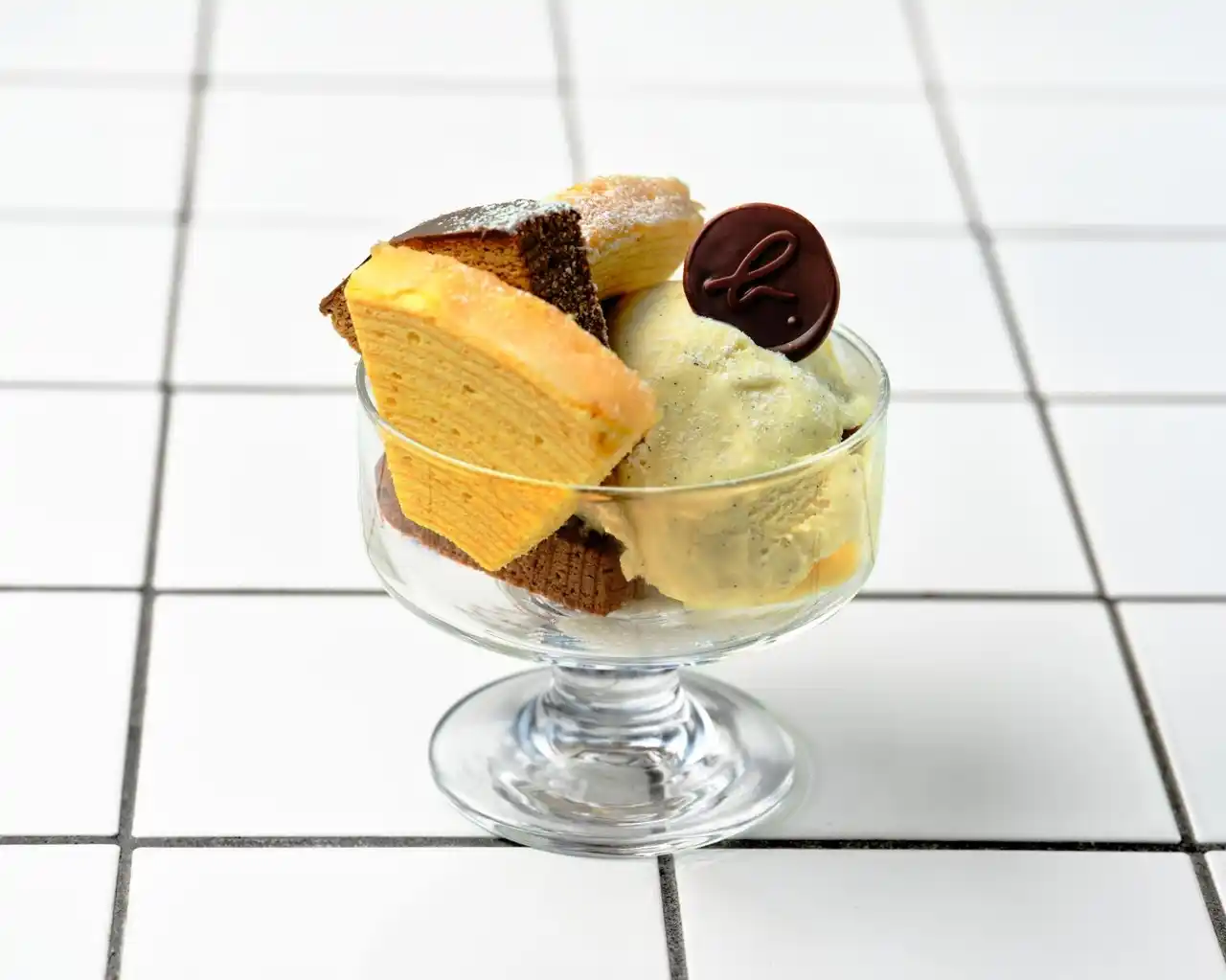 ユーハイムの人気商品“バウムクーヘン”を使ったミニパフェ。バターと卵の香りが広がるプレーンと、生地とコーティングで楽しむWチョコレートの2種に、バニラアイスクリームを添えた、アニエスベーならではの特別なデザートです。 |