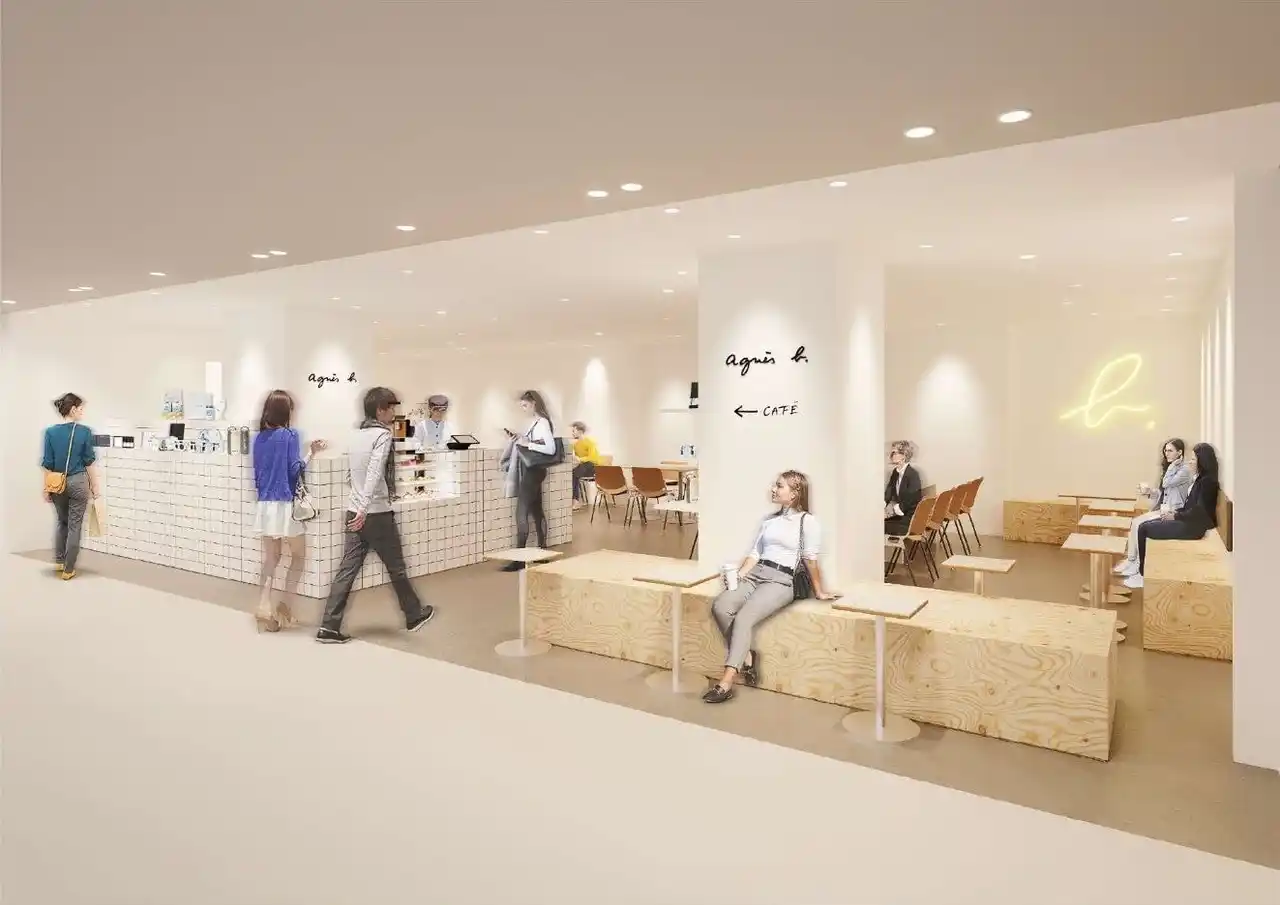 カフェの向かいには、お洋服やバッグのアニエスベーショップがあり、お買物の合間にカフェでくつろいでいただけます。 |