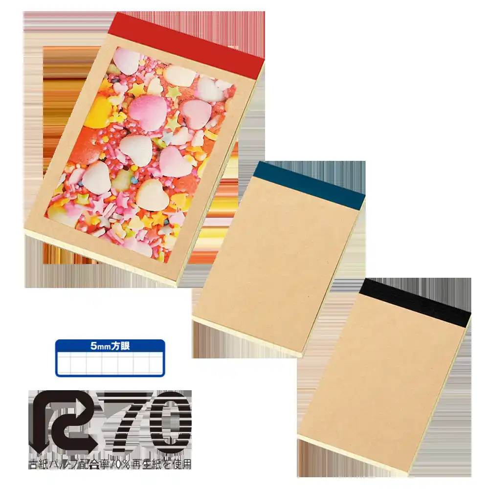 | 本文には5mm方眼用紙を採用しており、文字だけでなく図やラフスケッチも書きやすい仕様。再生紙ならではのやさしい風合いと落ち着いたカラーが特徴で、環境にも配慮したアイテムです。古紙パルプ配合率70%のR70マーク取得製品で、サステナブルな取り組みにも貢献します。 | |||
