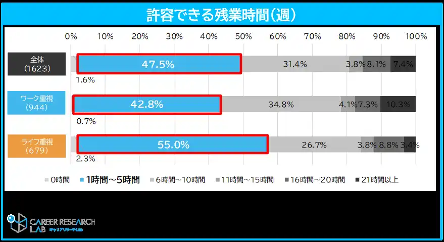 約6割の学生が、20代ではプライベートより仕事を重視したい。一方長時間労働は望まず、許容できる残業時間は「週1~5時間」が最多