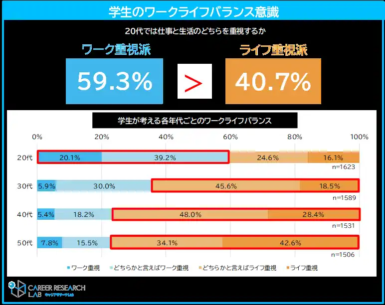 約6割の学生が、20代ではプライベートより仕事を重視したい。一方長時間労働は望まず、許容できる残業時間は「週1~5時間」が最多。4人に1人は「70歳以上」まで、働かなければならないと思う