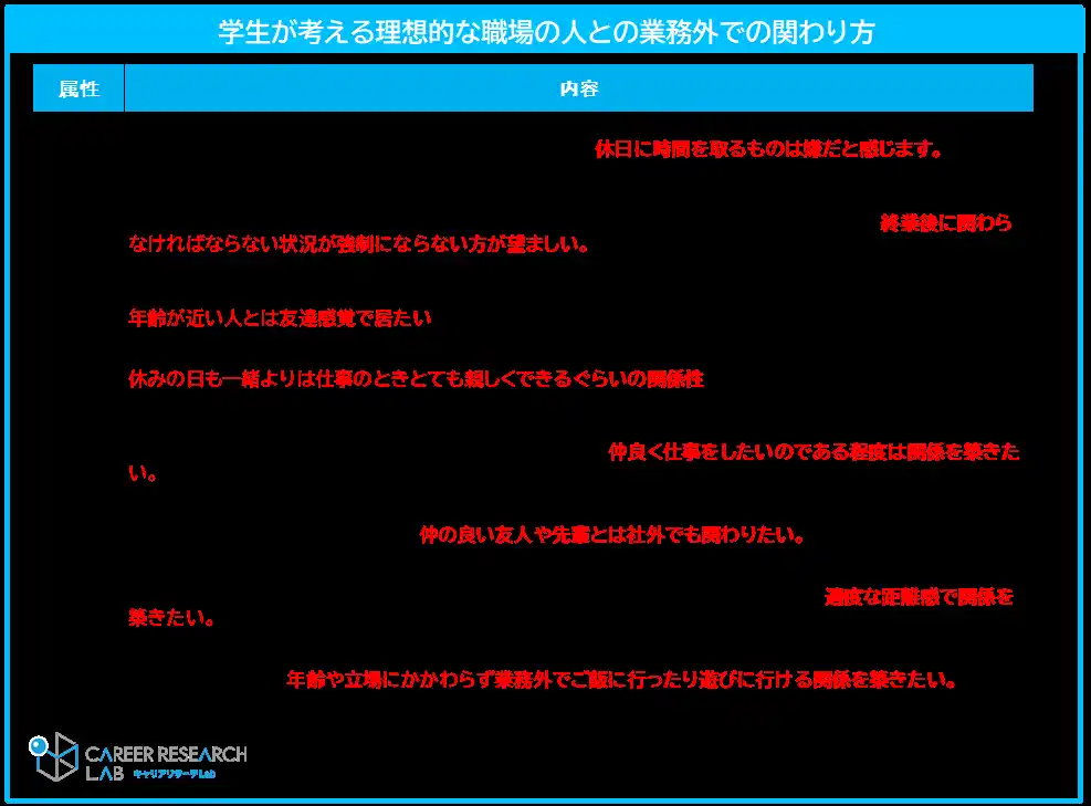 業務外において、「歓迎会」や「忘年会・決起会」などのイベントに前向きな意向も確認できました。学生はコミュニケーション自体を避けたいわけではなく、円滑に仕事を進めるために必要な関係性は大切にしている傾向があります。企業がこうした価値観を理解した上で関わることが、新入社員の職場適応への後押しになると考えられます。 |