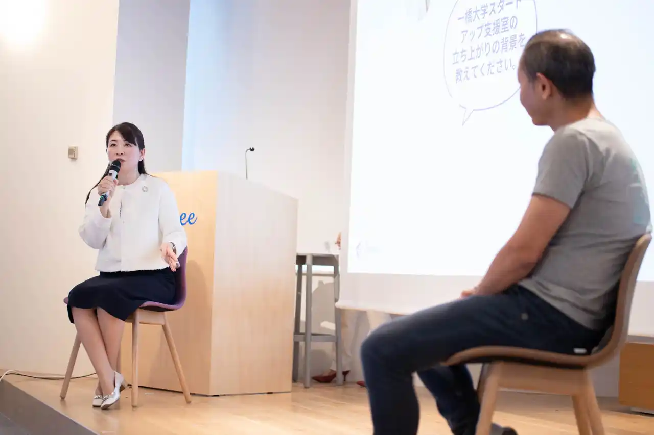 本協定の締結を記念し昨日4月16日に、一橋大学の卒業生であり、創業から東京証券取引所への上場を果たしたfreeeのCEO 佐々木大輔と、一橋大学副学長/スタートアップ支援室長の西野和美氏が一橋大学の学生を対象とした特別対談イベントを開催しました。 |