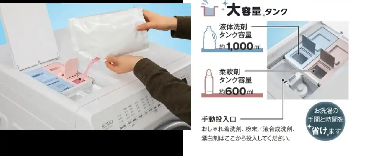 液体洗剤・柔軟剤の自動投入により、計量の手間を省き、入れ間違いや入れ忘れ、入れ過ぎを防ぐとともに、洗剤類を置くスペースも不要になります。タンクは液体洗剤約1,000ml、柔軟剤約600mlの大容量です。 |
