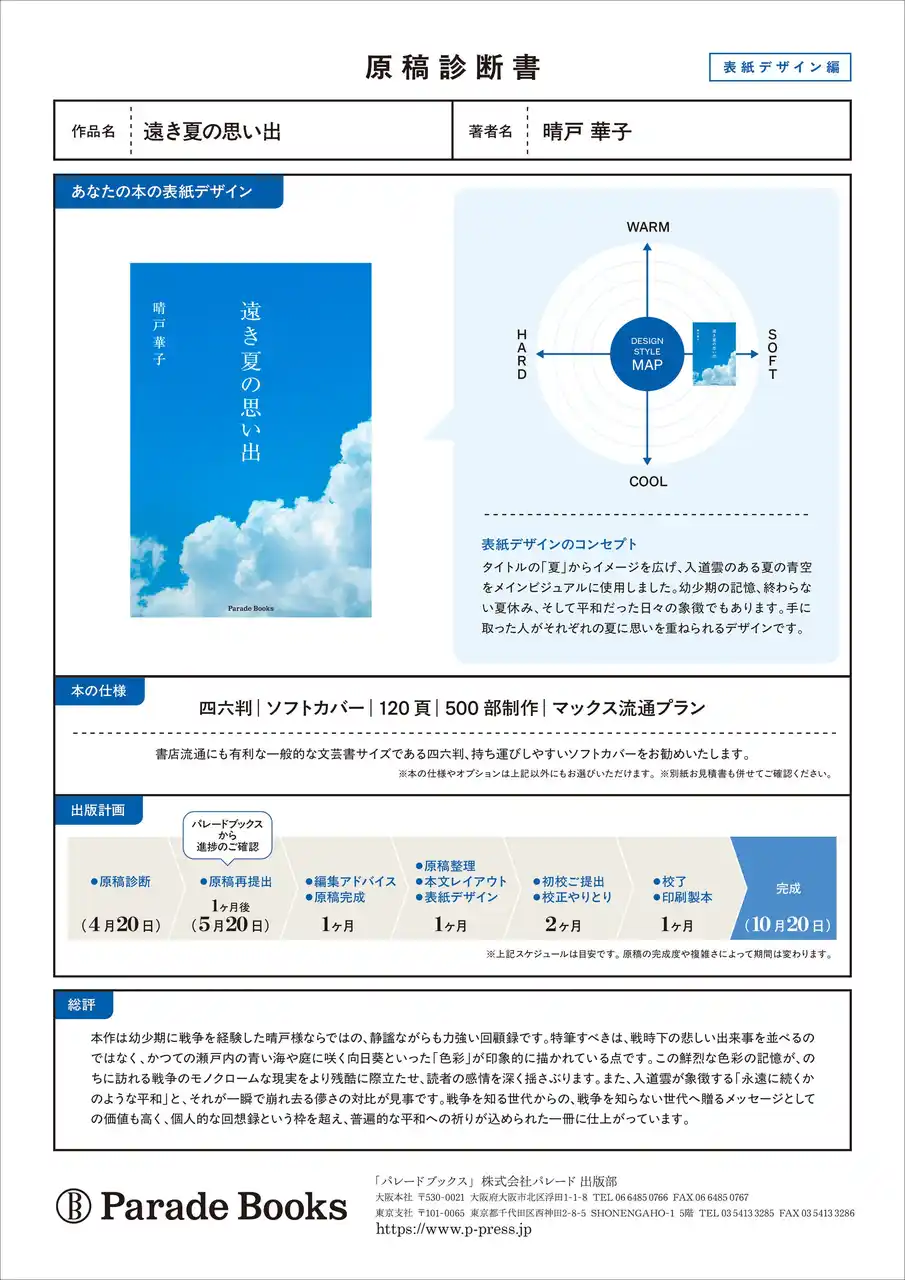 母体である株式会社パレードはデザイン制作会社。プロの技術と知識により、優れたデザインと高い品質であなたの本づくり&出版をトータルサポートします。 パレードブックス URL:https://www.p-press.jp TEL:0120-123455 Mail:paradebooks@parade.co.jp パレードブックスの書籍紹介 URL:https://books.parade.co.jp |