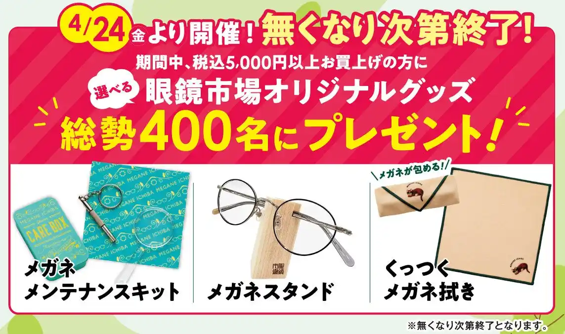 景品:メガネメンテナンスキット、メガネスタンド、くっつくメガネ拭き |