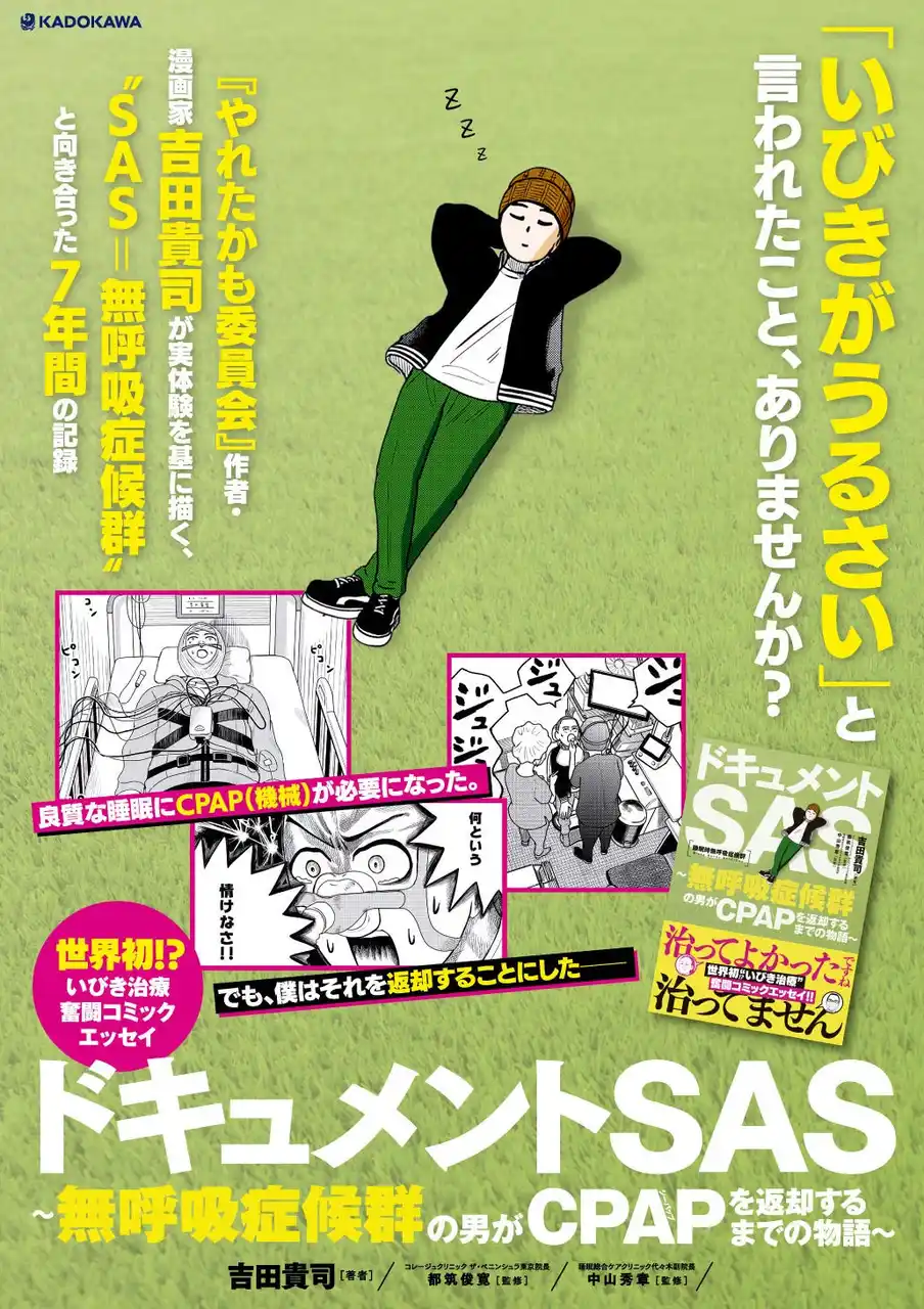 株式会社KADOKAWA(本社:東京都千代田区、取締役 代表執行役社長CEO:夏野 剛)より、コミックエッセイ『ドキュメントSAS~無呼吸症候群の男がCPAPを返却するまでの物語~』(著者・吉田貴司、監修・都筑俊寛、中山秀章)が絶賛発売中です。本日4月17日(金)より、漫画サイト「カドコミ」、「ニコニコ漫画」にて期間限定の試し読み増量を開始いたしました。 |