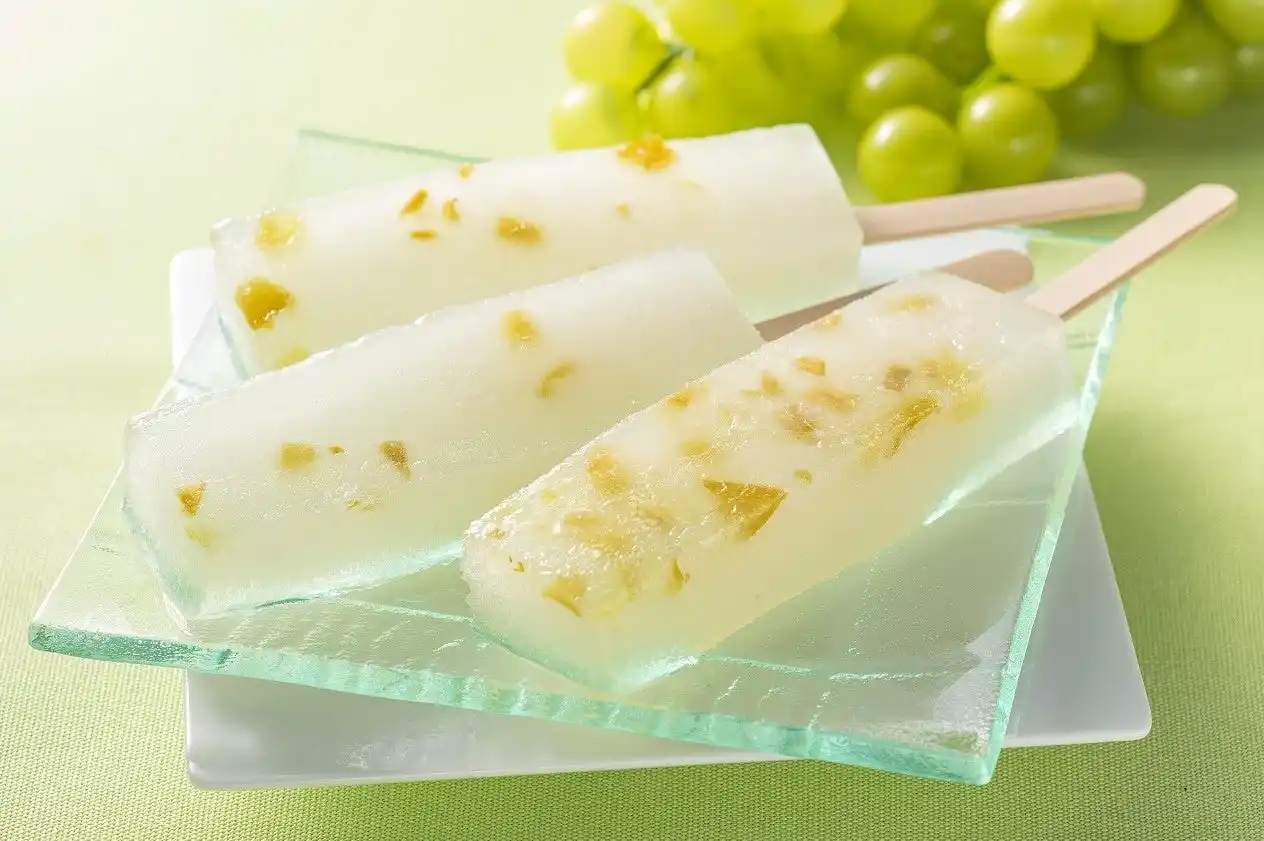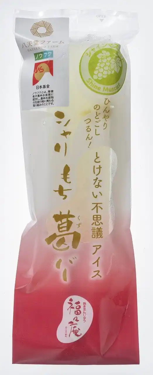 | 「シャリもち葛バー」は、福々庵の主力商品で和菓子の「葛粉」を使った、半解凍で食べる溶けない新食感が人気のアイスです。この度の『シャリもち葛バー(シャインマスカット)』は、八天堂ファームが社会福祉法人宗越福祉会と竹原市にある八天堂ぶどう園にて、農福連携で栽培したシャインマスカットのジャムを使用しています。 | ||||||||||||||