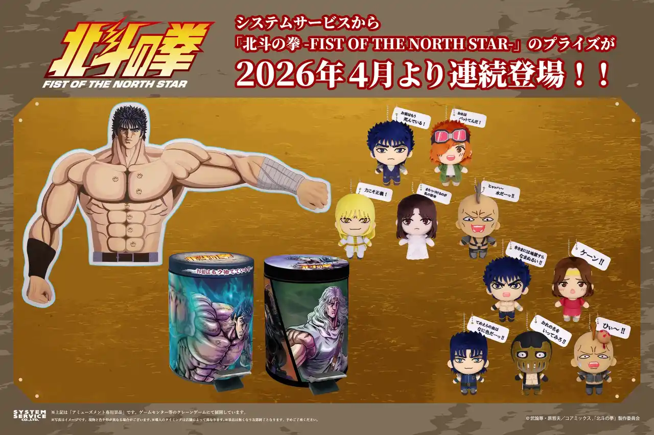 システムサービス株式会社(本社:東京都豊島区、代表取締役社長:田村宗弘)は「北斗の拳 -FIST OF THE NORTH STAR-」のプライズ商品を2026年4月より順次アミューズメント施設にて展開いたします。 |