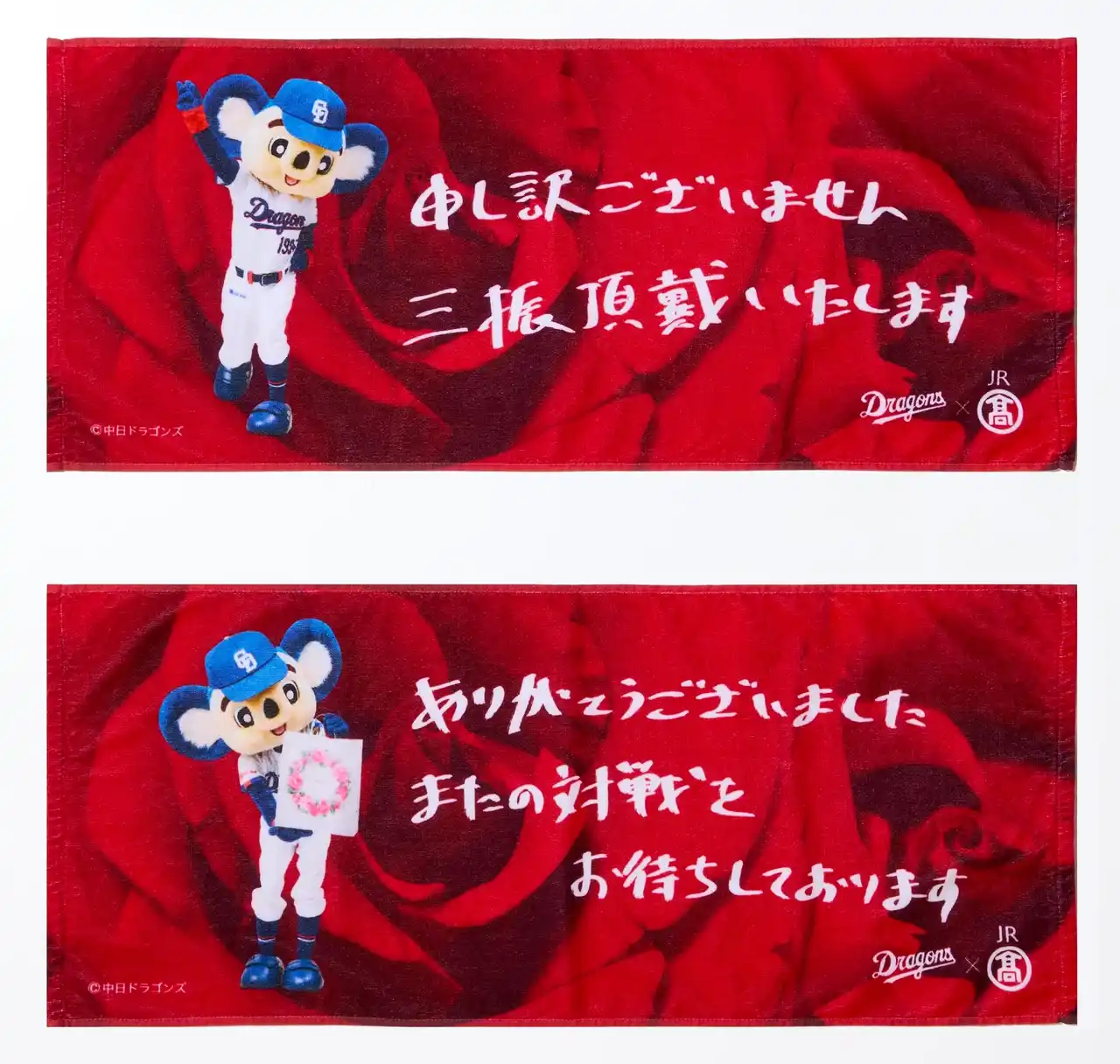 上)タオル 申し訳ございません 三振頂戴いたします、下)タオル またの対戦をお待ちしております 各2,420円 ※お一人様各2点限り |