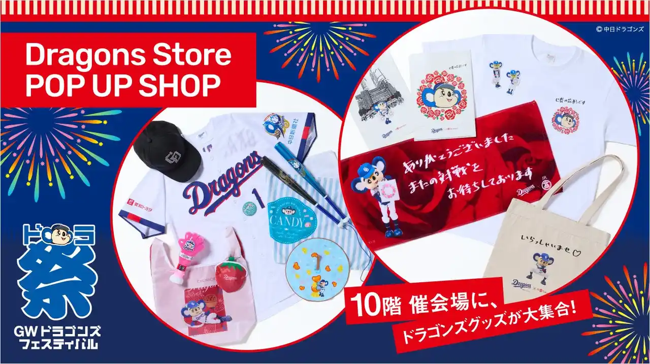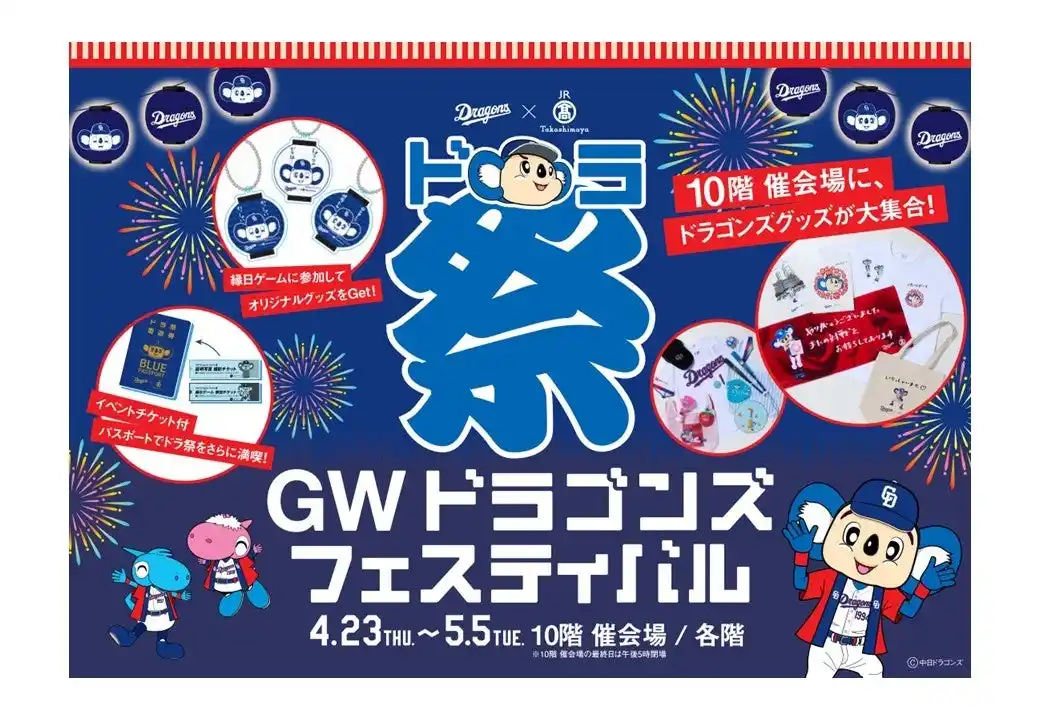 大型連休にあわせて、中日ドラゴンズと連動したイベント「GW ドラゴンズ フェスティバル(ドラ祭)」を開催。“遊ぶ・記録する・持ち帰る”をテーマに、来場者一人ひとりの思い出が“かたち”として残る企画をはじめ、球団承認グッズや中日ドラゴンズ球団公式マスコット「ドアラ」との会場限定コラボグッズも販売します。 |