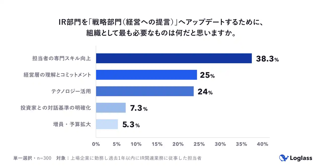 ・IR部門の戦略部門化に必要な要素としてスキル向上(38.3%)、経営層の理解(25.0%)、テクノロジー活用(24.0%)が挙げられた。増員・予算拡大に期待する声は5%台にとどまった。 |