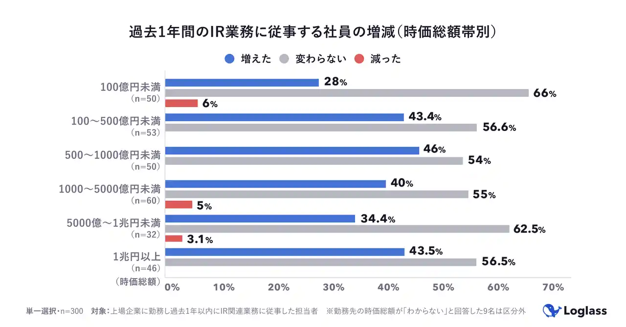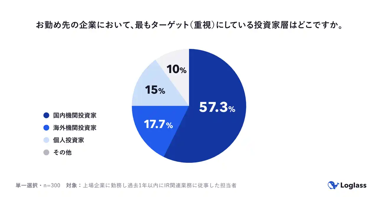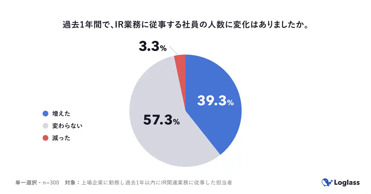 株式会社ログラス(本社:東京都港区、代表取締役 執行役員CEO:布川 友也、以下「当社」)は、上場企業でIR関連業務に関与する担当者300名を対象に「上場企業のIR部門における業務実態調査」を実施しました。 |
